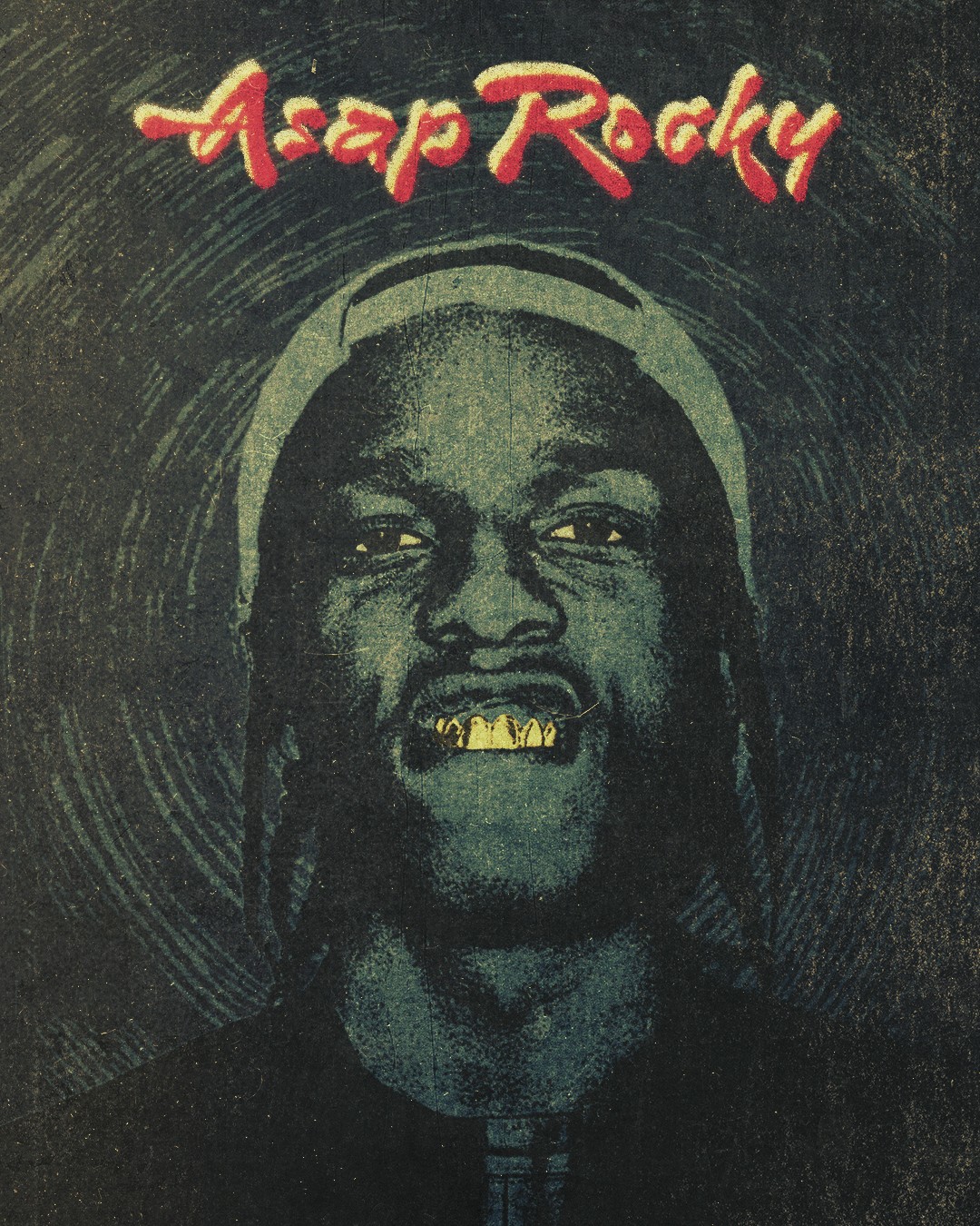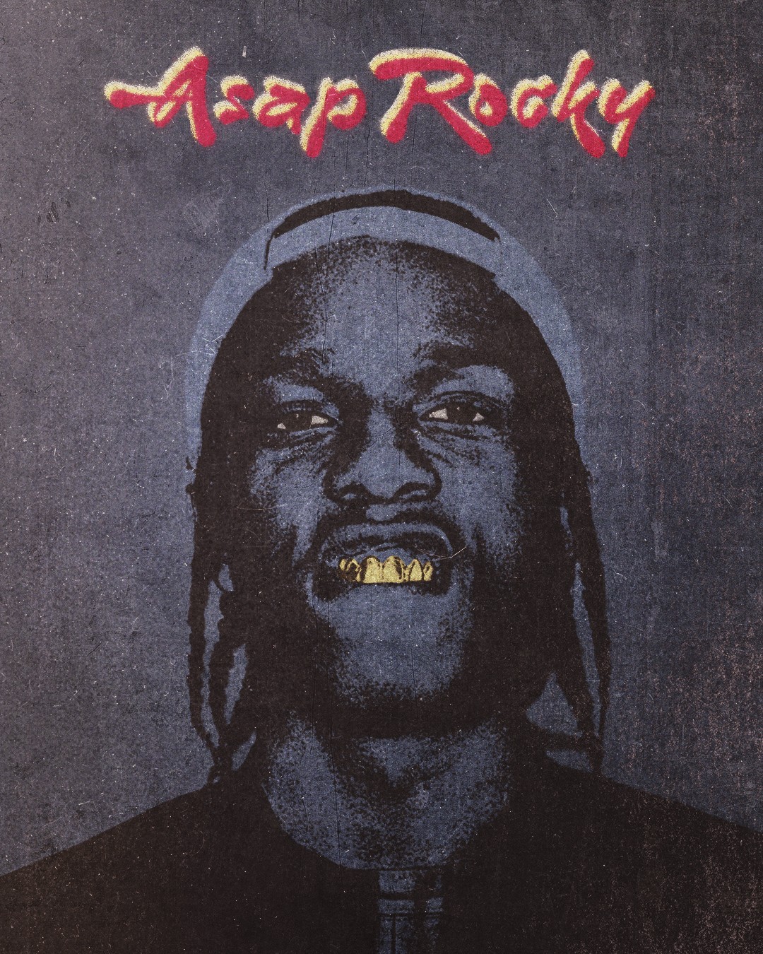 A raw, atmospheric portrait anchored by the bold ASAP Rocky lettering, blending worn textures, deep shadows, and gold-toned attitude. A fusion of retro grit and modern hip-hop energy that feels both iconic and underground.