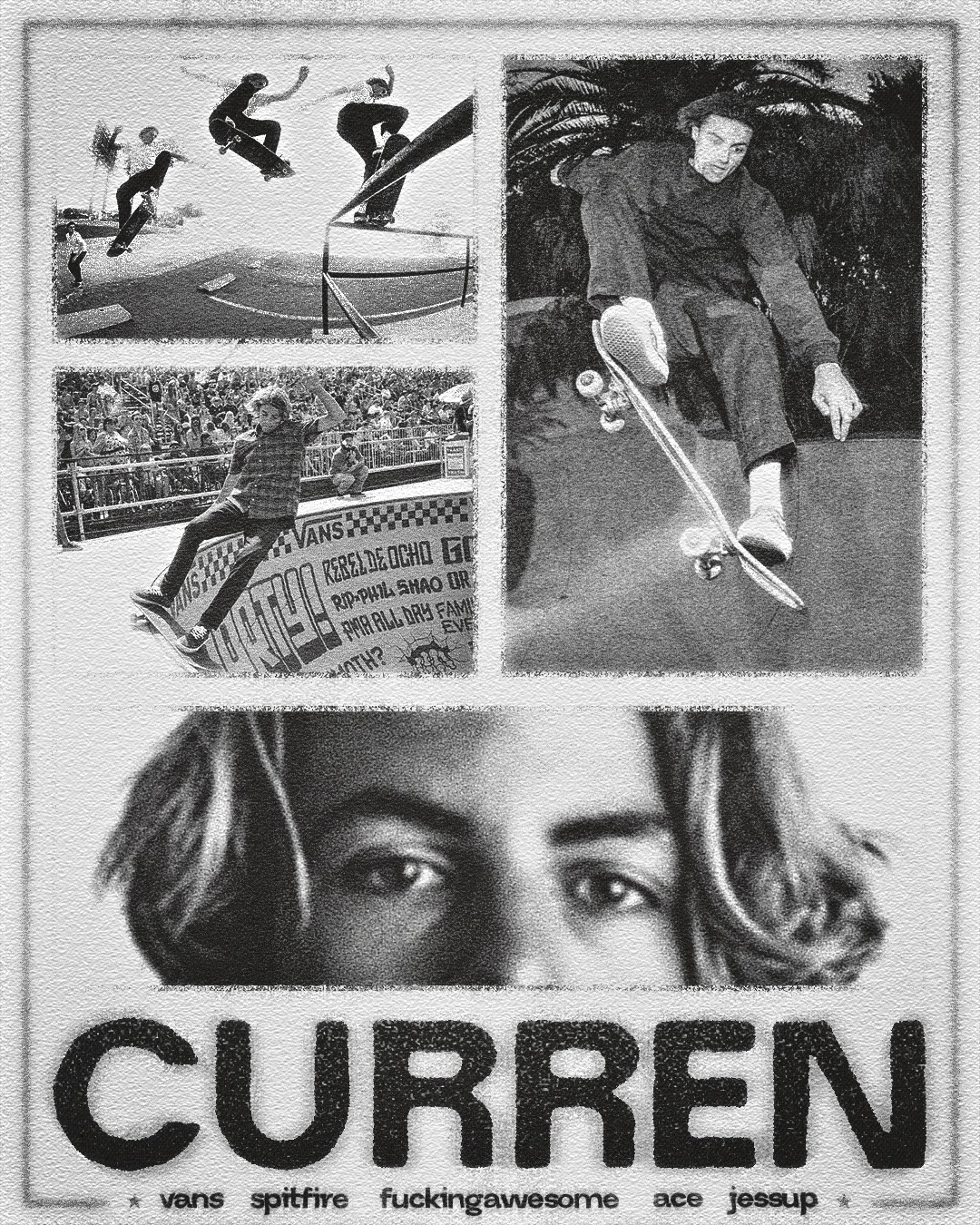 A visual tribute to Curren Caples — capturing his effortless flow, fearless style, and deep connection to skateboarding. Designed as a collage of moments frozen in motion, this piece celebrates the balance between progression and style that defines Curren’s presence both on and off the board.