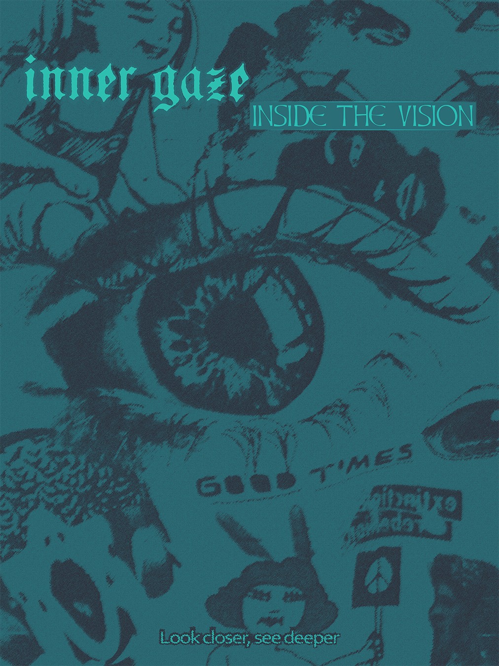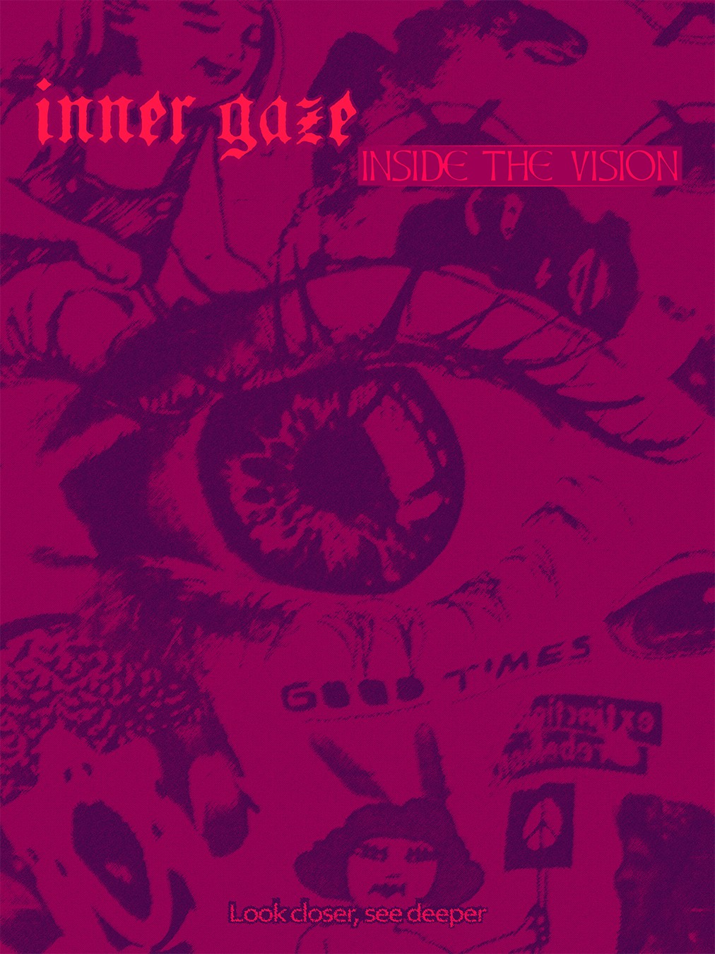A poster that delves into introspection and the mystery of the inner look. Inspired by gothic and vintage aesthetics, it combines textured collages and visual symbols that evoke perception, memory and dream. The dark layers and subtle contrast between classical typography and distorted forms create an atmosphere of contemplation - where every detail reveals something hidden.