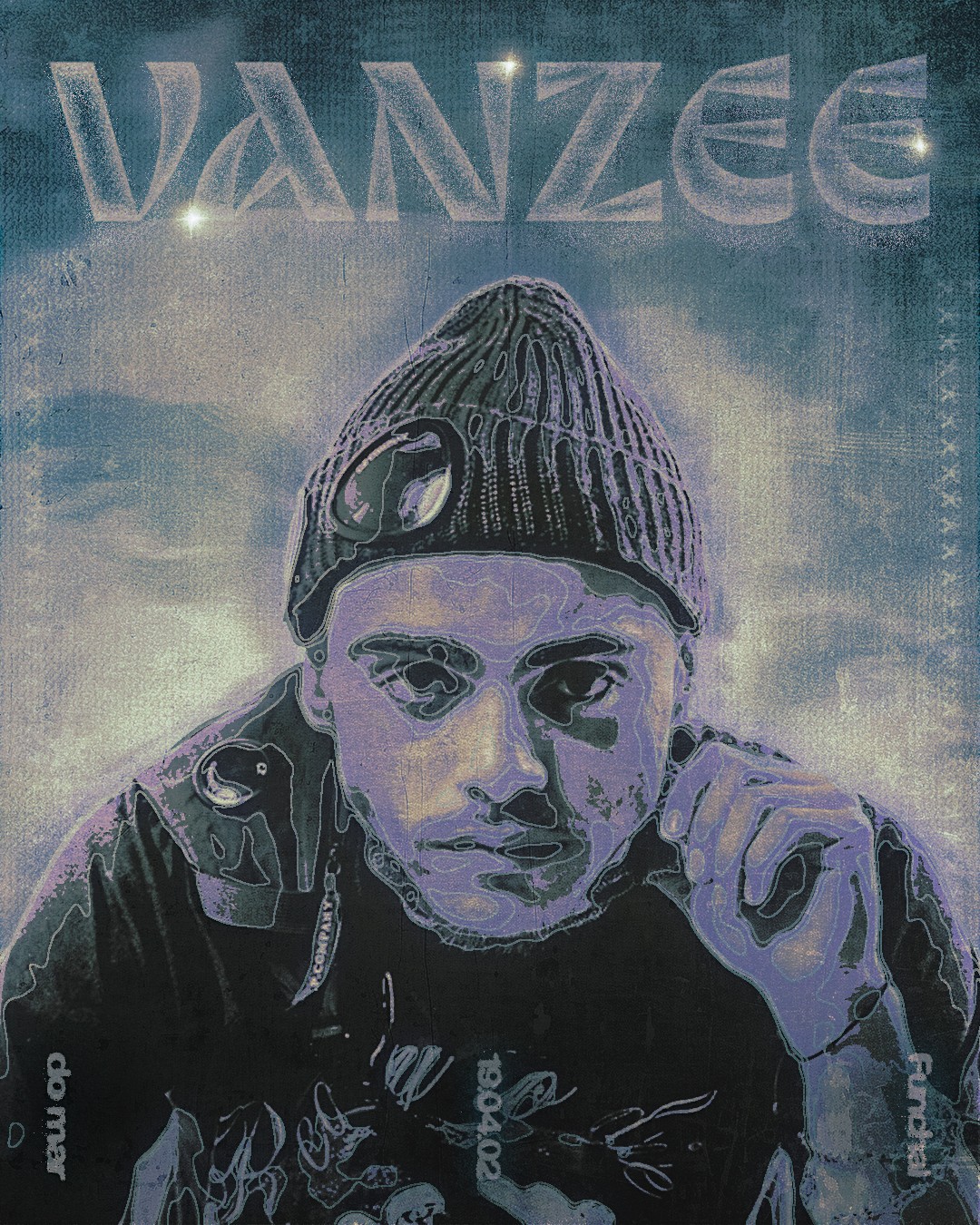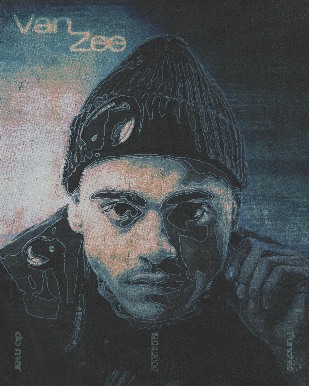 This series reimagines Van Zee through a textured, ocean-inspired aesthetic that reflects both his name and artistic identity. Each variation explores a different mood, building a visual link to the sea, the island atmosphere, and the emotional tone present in his music. The result is a set of experimental portraits that merge organic depth with digital distortion, giving the artist a raw, atmospheric presence.